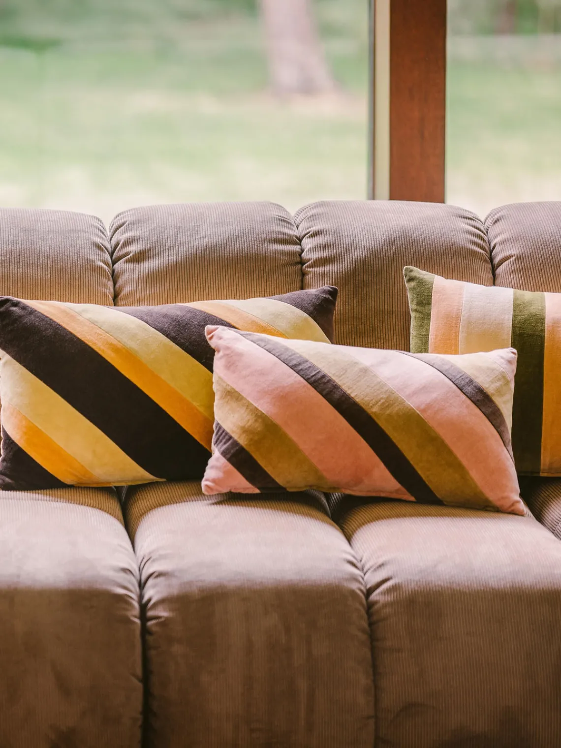 Los cojines de terciopelo a rayas tienen lo necesario para destacar. Sus texturas exuberantes y sus emocionantes combinaciones de colores los hacen perfectos para mezclar y combinar o como punto focal en una composición delicada.
