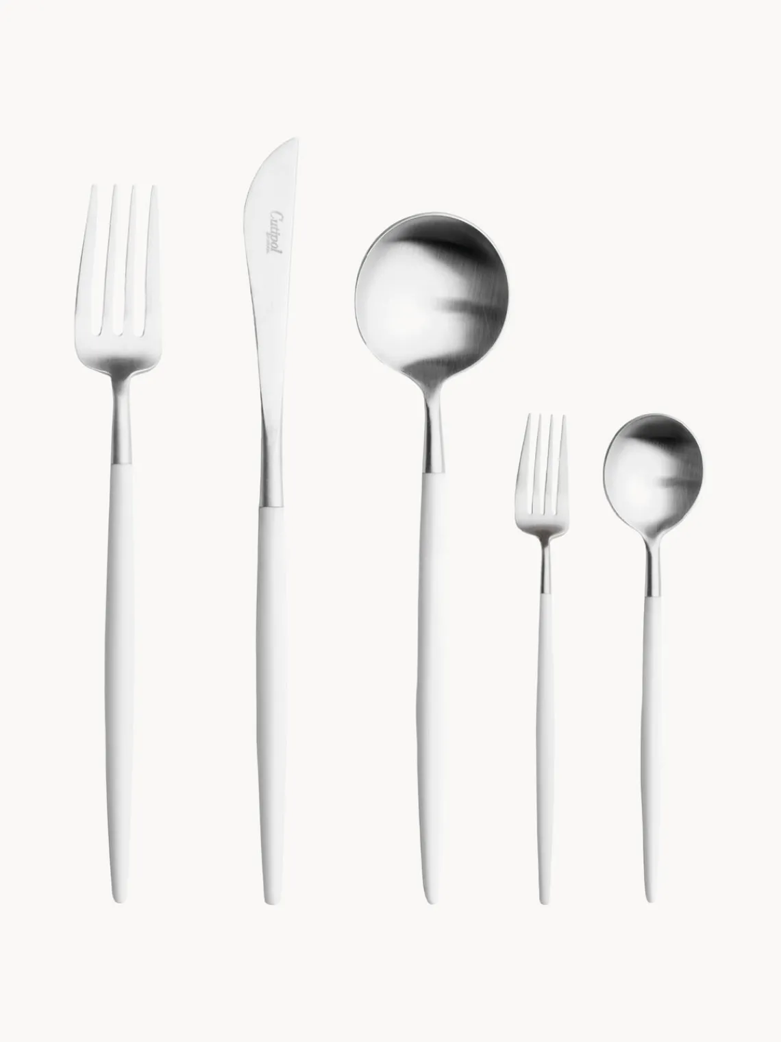 Cubertería de 5 piezas hecha a mano que incluye un tenedor de mesa, un cuchillo de mesa, una cuchara de mesa, un tenedor de postre y una cuchara de postre.
