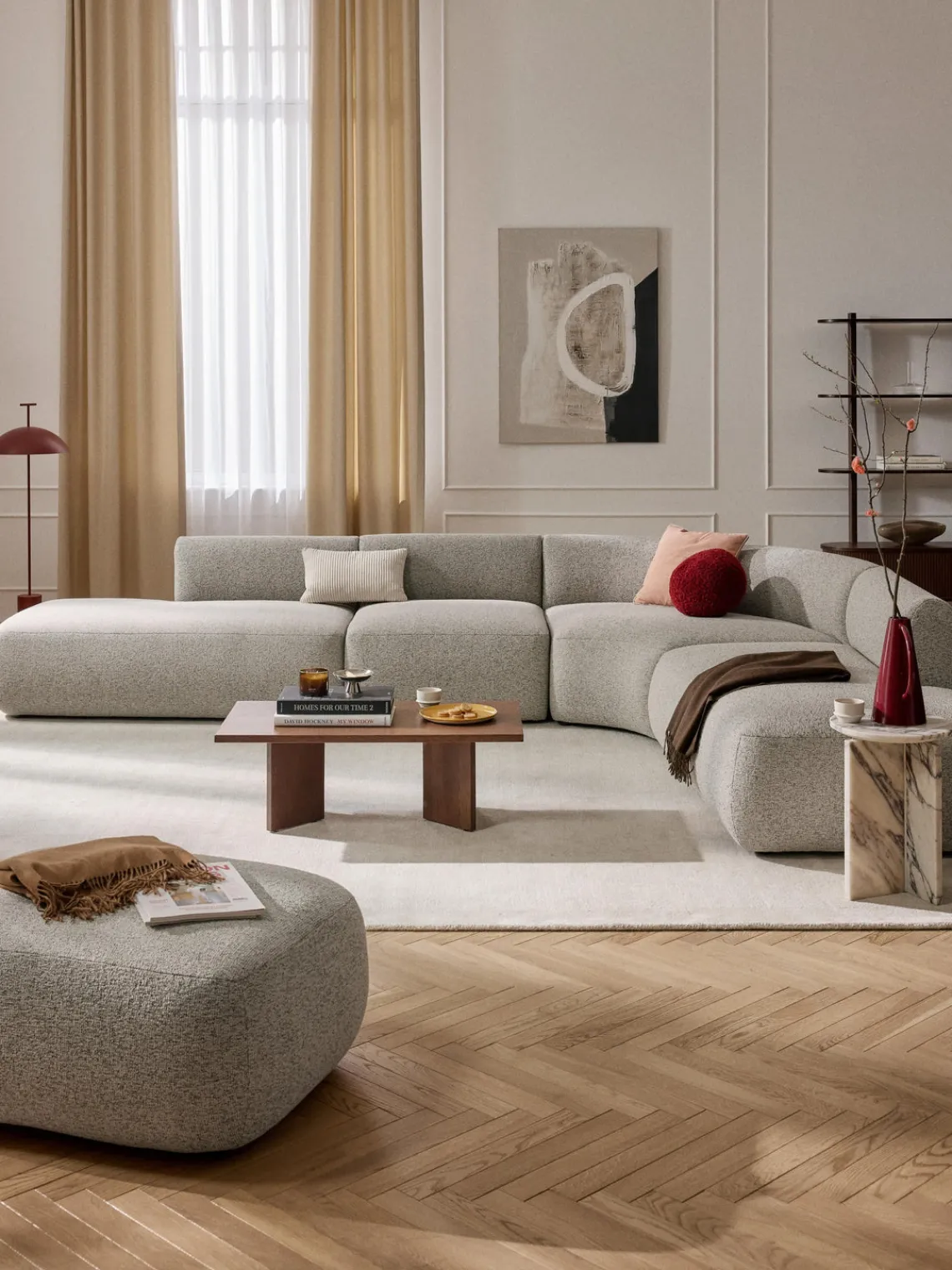 Los 4 módulos pueden combinarse para crear formas diferentes. El sofá se entrega en 4 partes que pueden montarse individualmente mediante cierres situados en la parte inferior de los módulos.