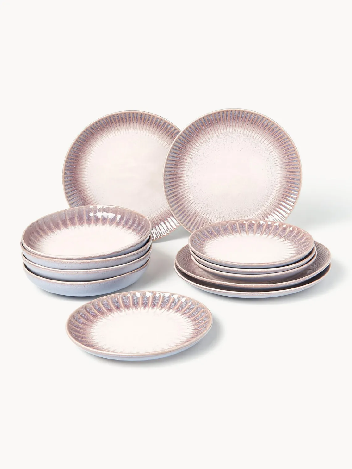 Esta vajilla de 12 piezas hecha a mano con esmalte reactivo y relieve en el borde consta de cuatro platos llanos, cuatro platos postre y cuatro platos hondos.