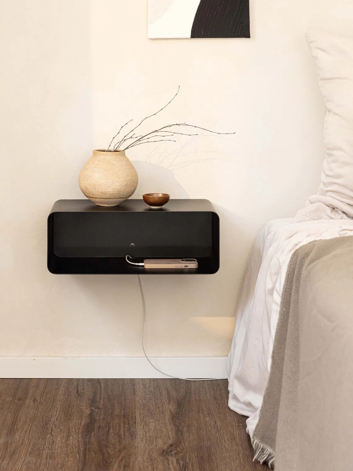 La gestión de cables integrada garantiza un orden adicional junto a la cama.
