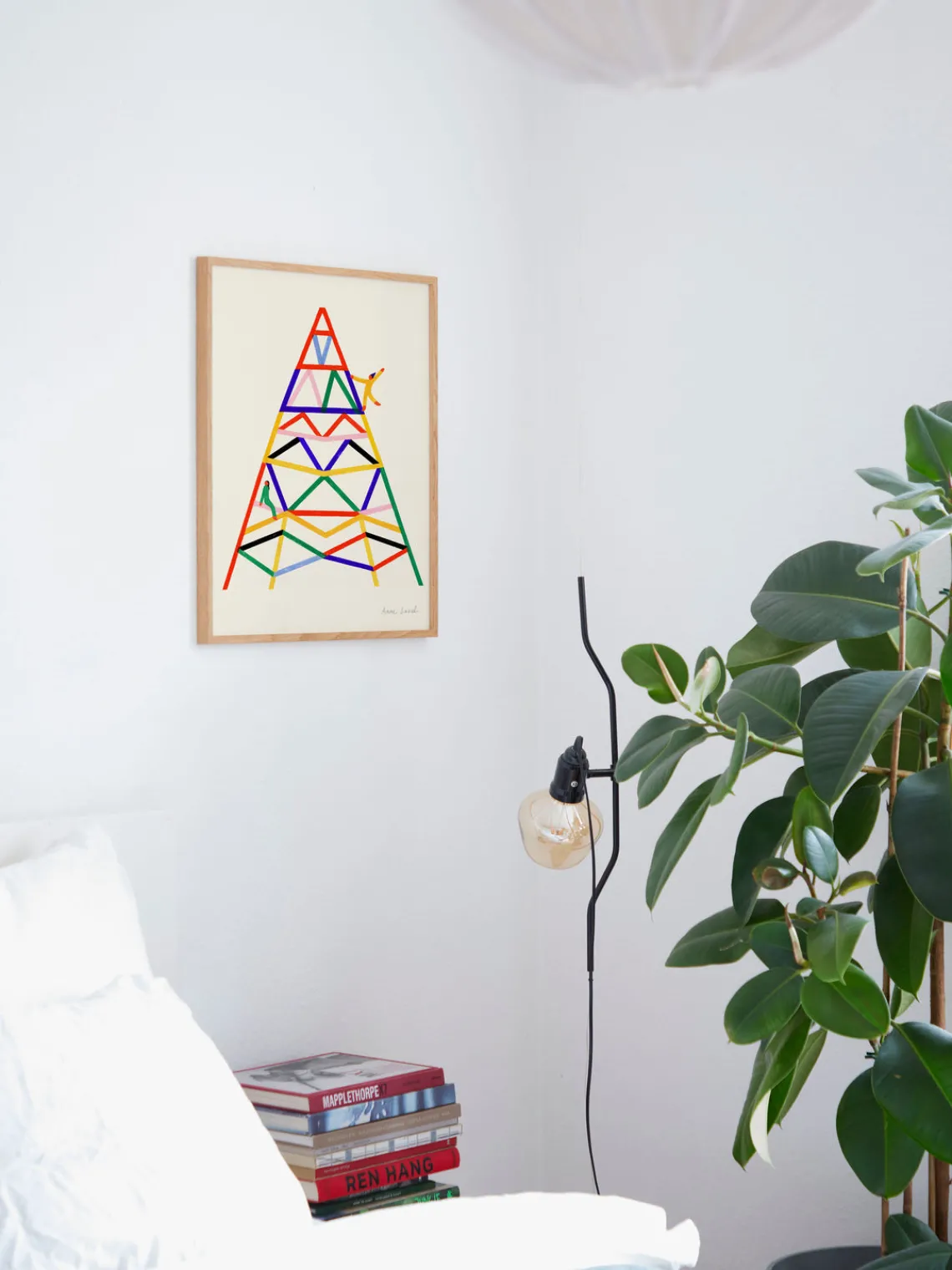ESCALADER de la artista francesa Anne Laval explora el impulso juvenil de explorar y escalar. Combinando formas estampadas en madera con gouache y pasteles dibujados a mano, un columpio de gran tamaño irradia color y presenta a dos personajes disfrutando de la libertad de escalar.