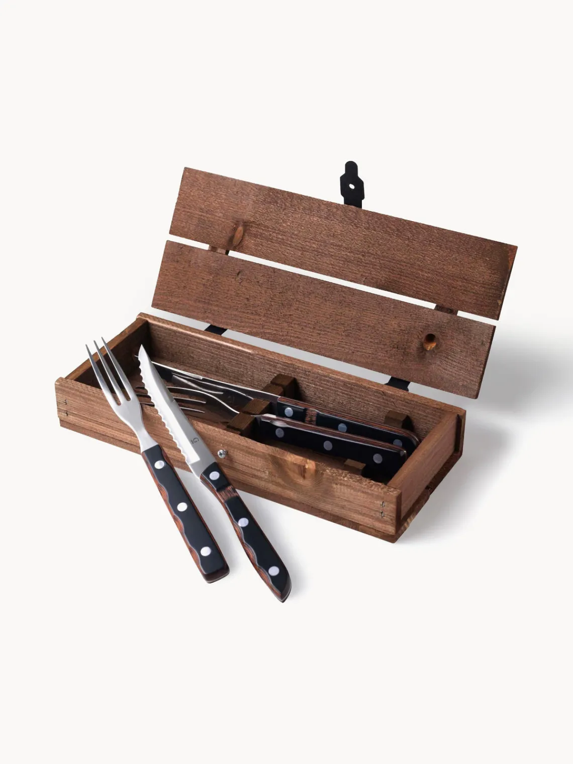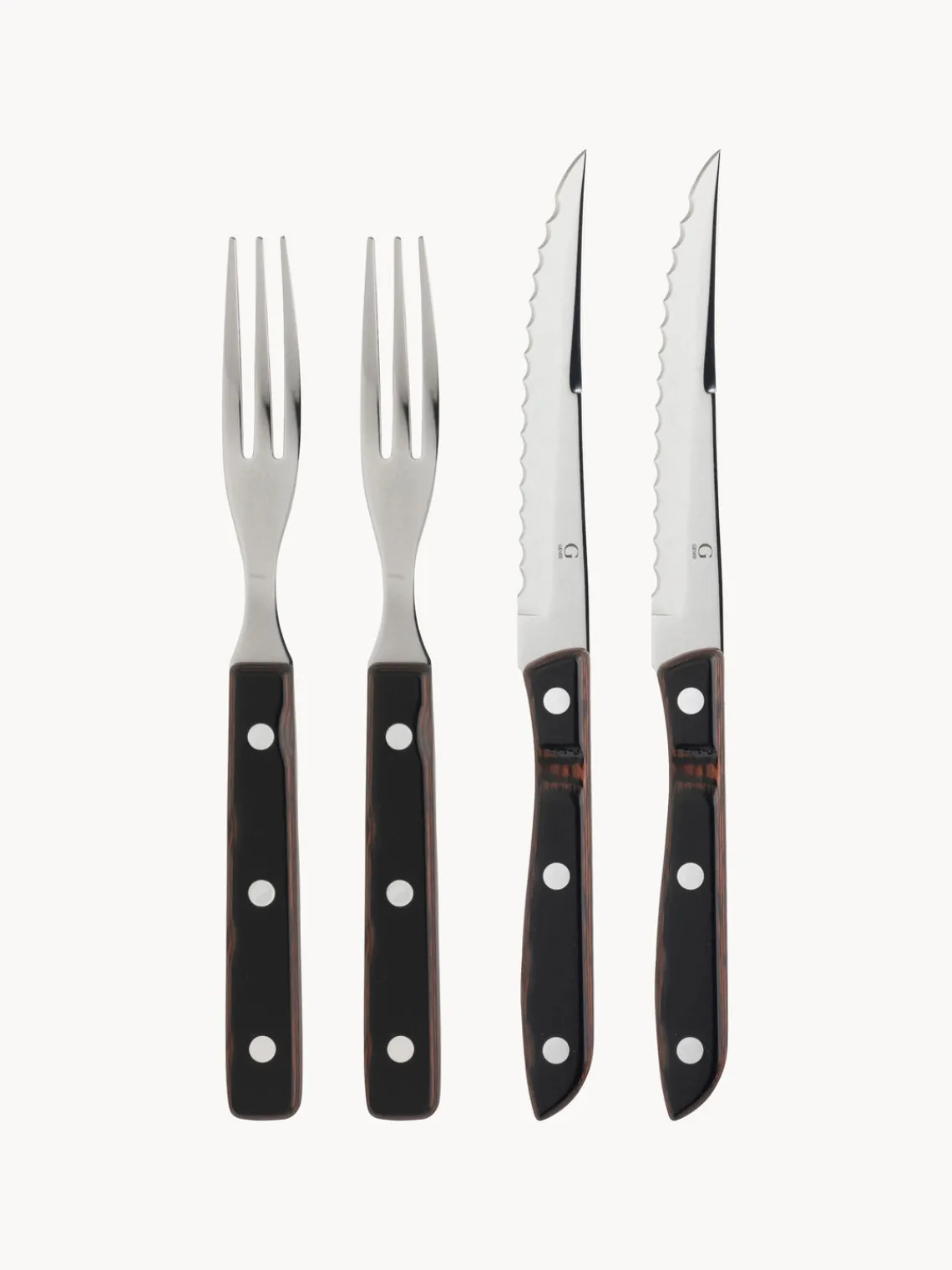 Este juego de cubiertos de 4 piezas consta de dos cuchillos y dos tenedores para carne.