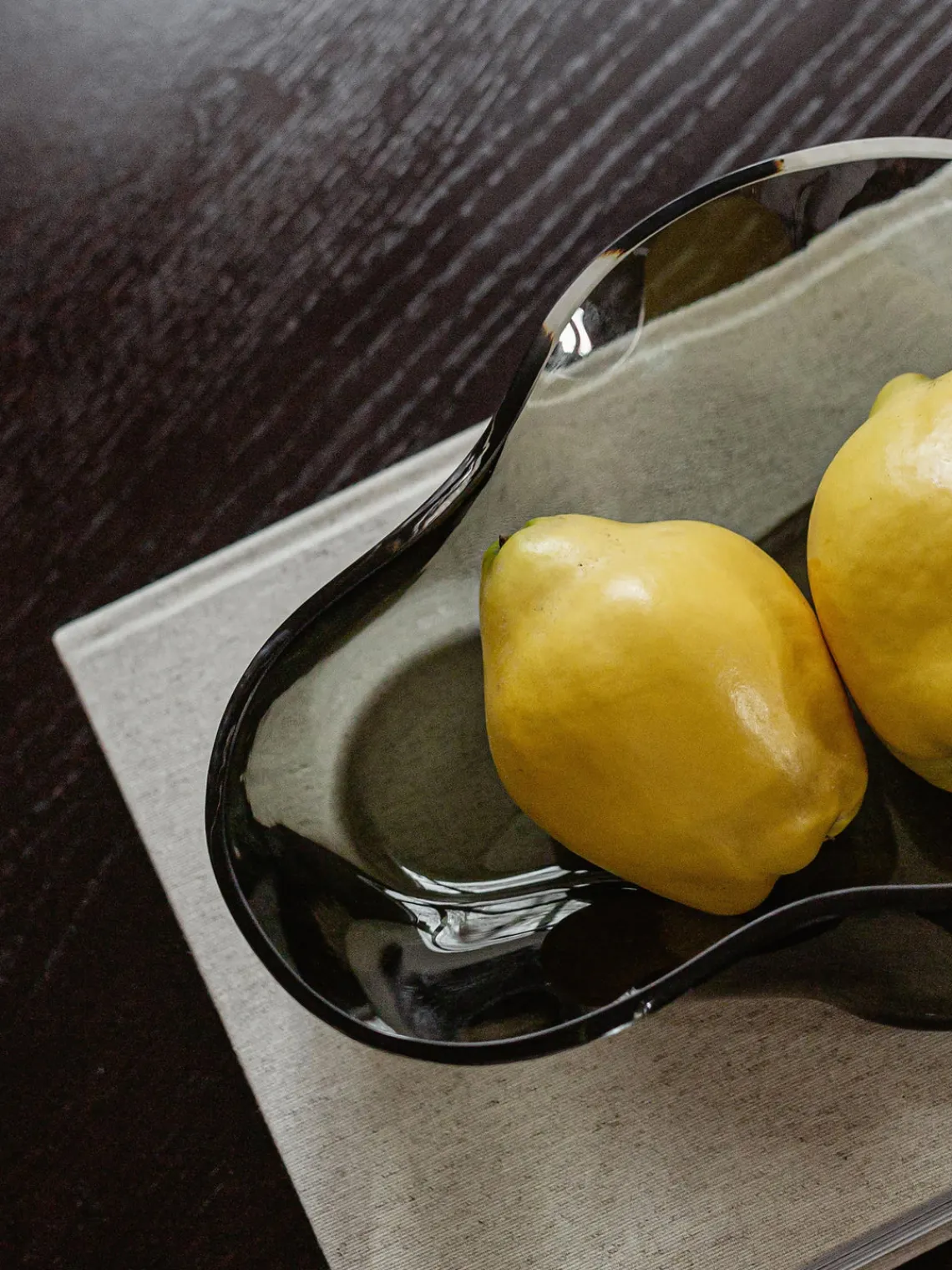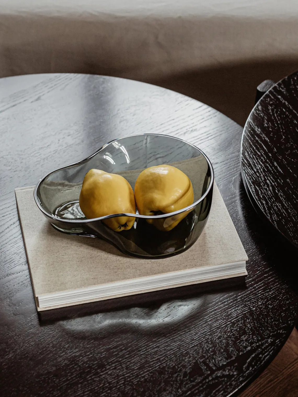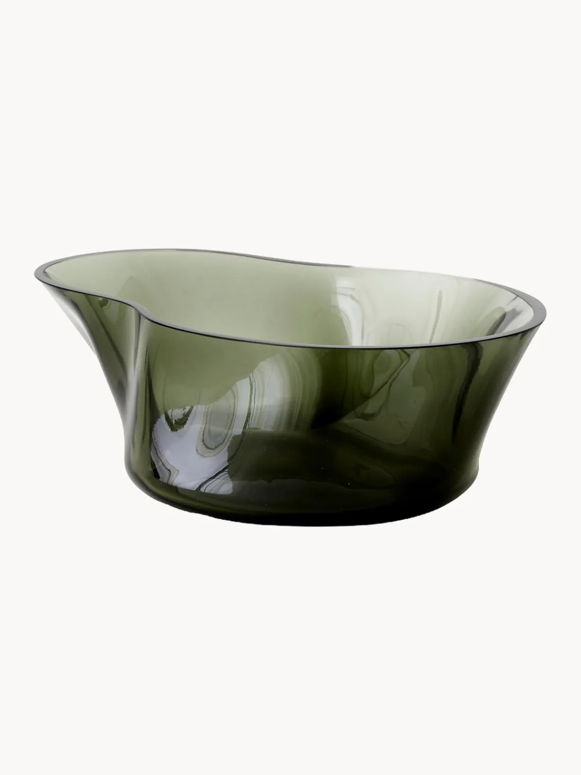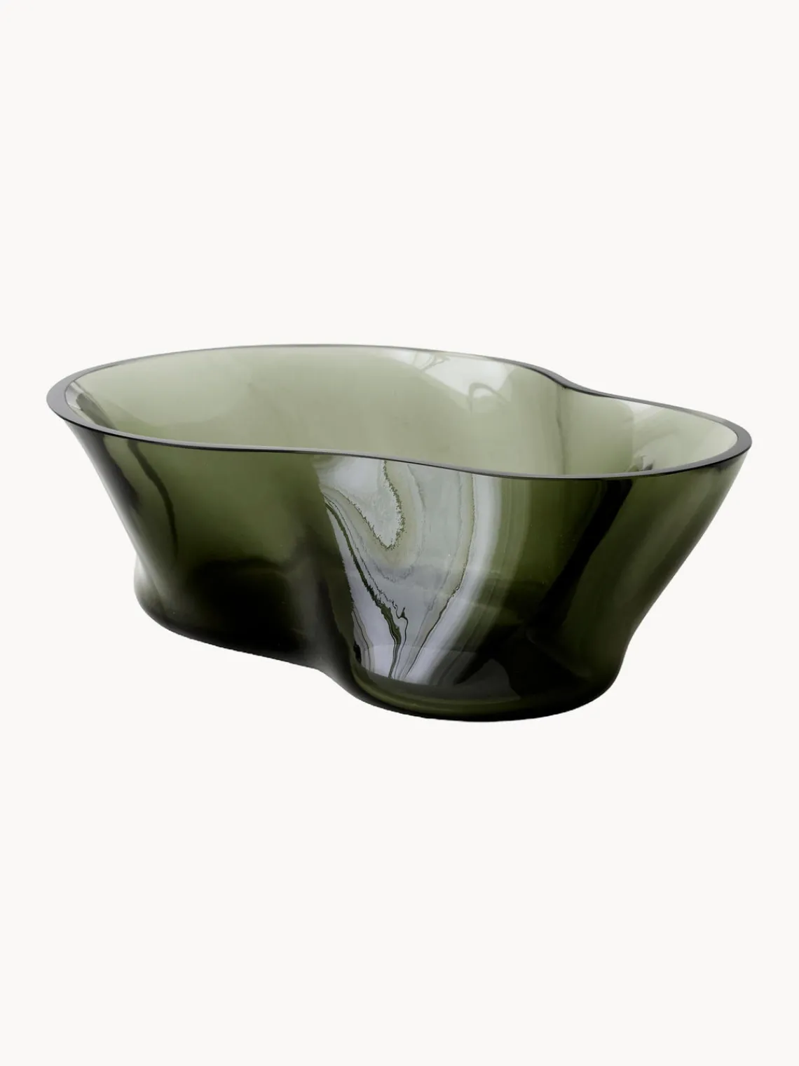 El cuenco decorativo AER de vidrio ahumado en forma de ola confiere a las superficies un atractivo escultural, tanto si está lleno de golosinas como si se coloca sobre una superficie como objeto decorativo. Inspirado en el movimiento en espiral del aire visto a través del humo o la niebla, el cuenco tiene forma asimétrica, se estrecha suavemente hacia un lado y presenta una textura ondulada. Cerca de la luz natural -en el alféizar de una ventana o sobre una mesa- parece etéreo, y los reflejos y refracciones de la luz dan vida al diseño y a la superficie sobre la que se encuentra. Cada cuenco soplado a mano tiene características visuales diferentes que reflejan su singularidad.
