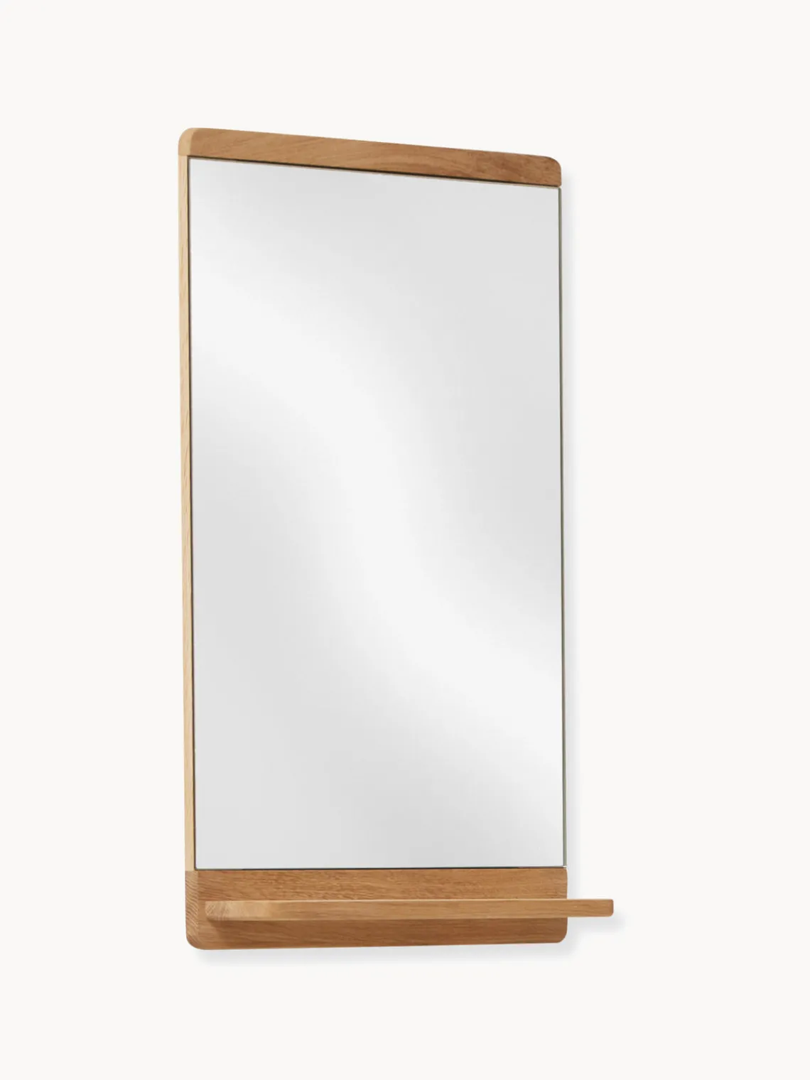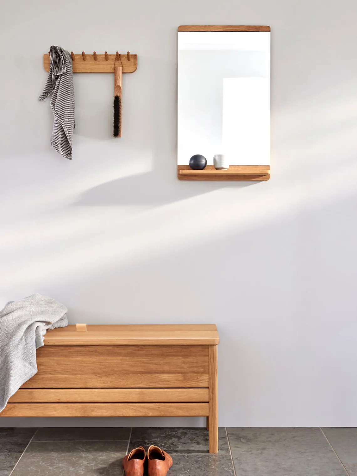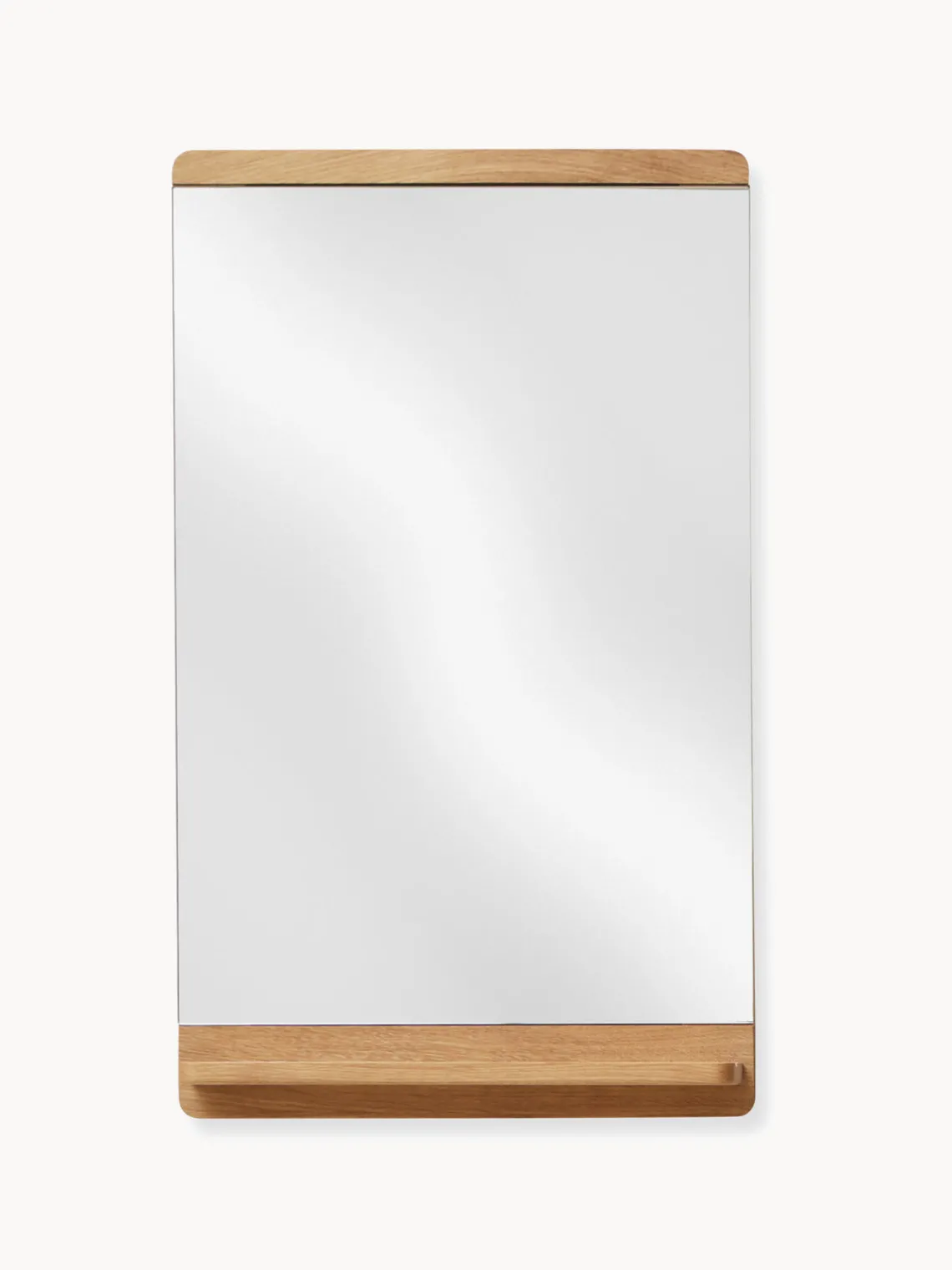 Queríamos crear un espejo clásico y delgado con detalles de madera blanda visibles que lo elevaran de la pared. Los paneles planos en la parte superior e inferior le dan al espejo una expresión cálida a medida que se vuelve visible la veta de la madera. Las tiras de madera que rodean la parte trasera del espejo tienen un gran radio, lo que crea una sombra suave en la pared. – Jonas Herman, Herman Studio