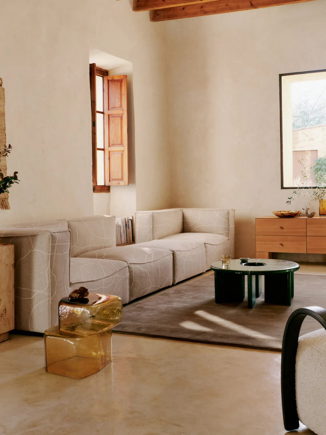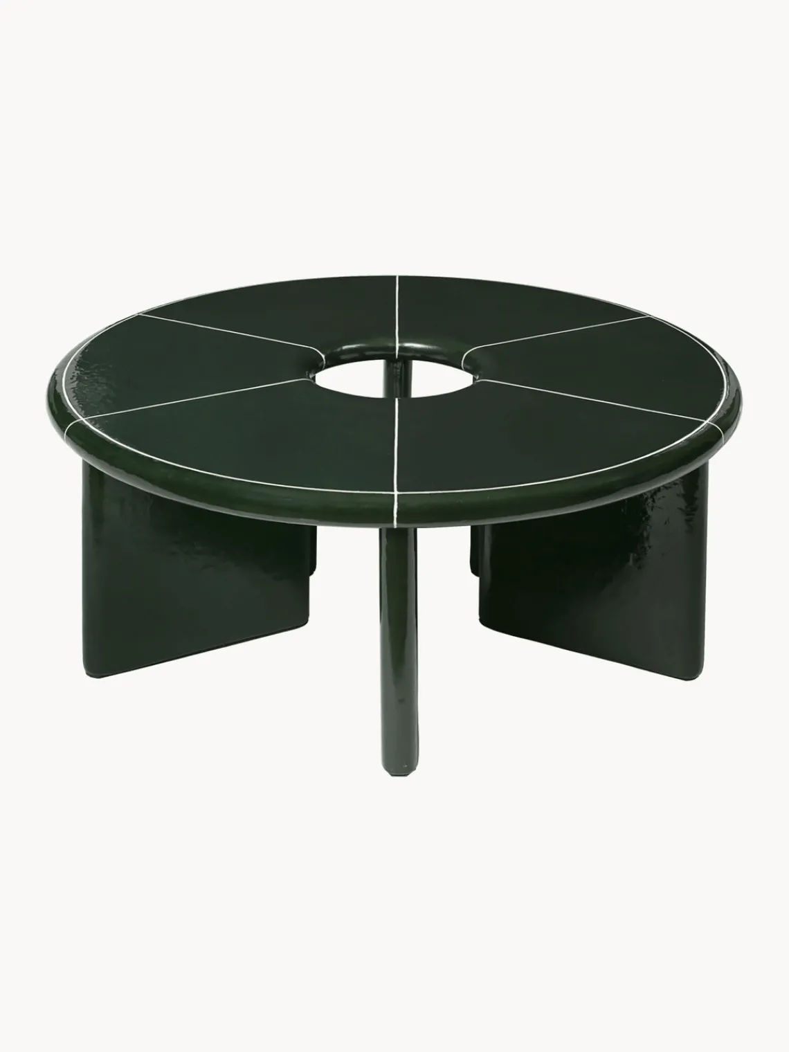 La mesa de centro DEYA se caracteriza por un llamativo esmalte verde oscuro de textura irregular, acentuado por líneas de unión blancas. La tapa segmentada de la mesa crea un aspecto geométrico atrevido, complementado con bordes generosamente redondeados para rendirle un aire suave.