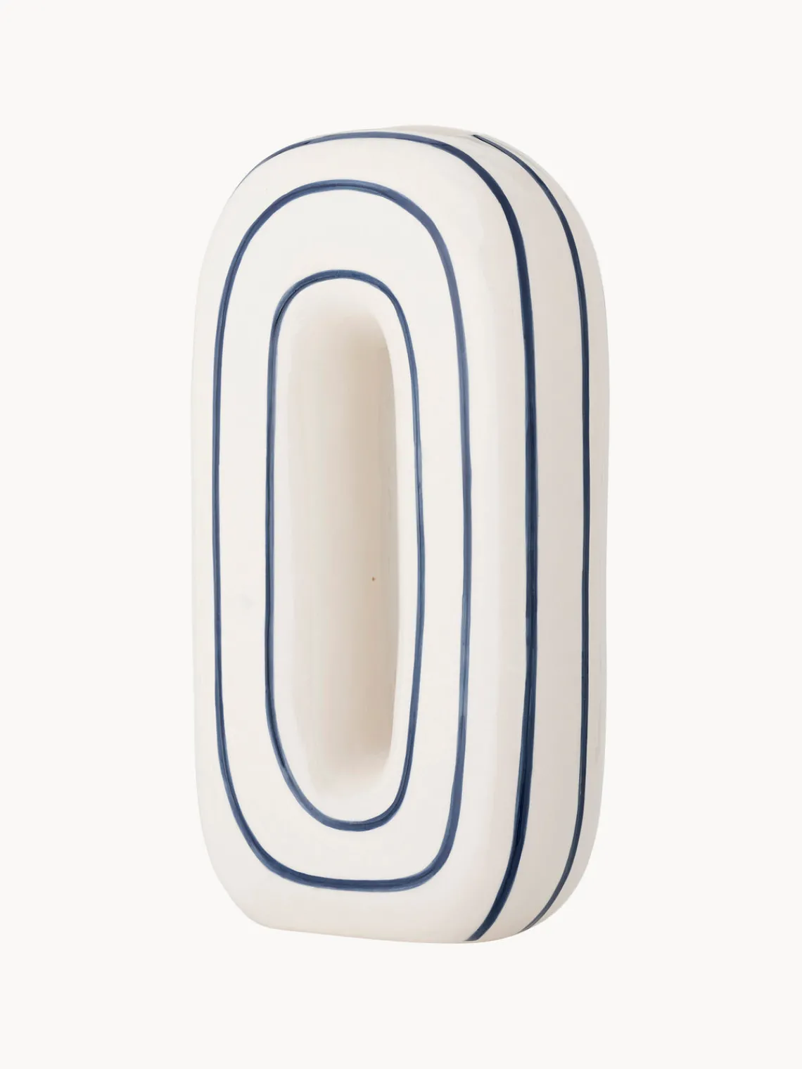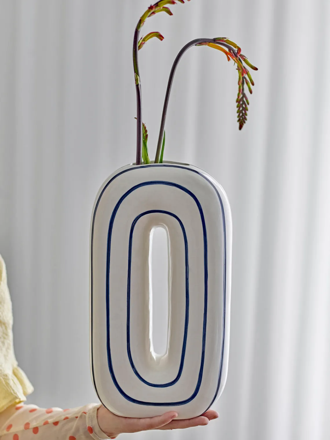 El jarrón MAE de Bloomingville está hecho de cerámica y decorado con rayas azules pintadas a mano. Ideal para colocar flores frescas o como pieza decorativa independiente, cada jarrón es único gracias a la técnica de pintura artesanal y las sutiles variaciones en la intensidad del color.