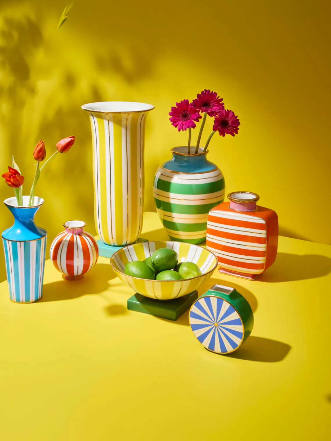 Las rayas son para siempre y un toque de color divertido es elegante, elegante, ELEGANTE. Las piezas PORTOFINO están hechas de porcelana de alta cocción, envueltas en rayas de colores brillantes y terminadas con un esmalte brillante.