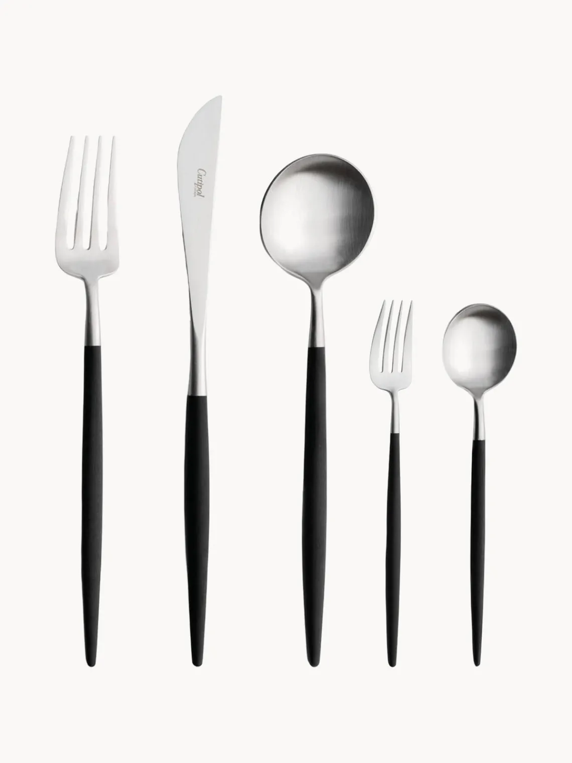 Cubertería de 5 piezas hecha a mano que incluye un tenedor de mesa, un cuchillo de mesa, una cuchara de mesa, un tenedor de postre y una cuchara de postre.