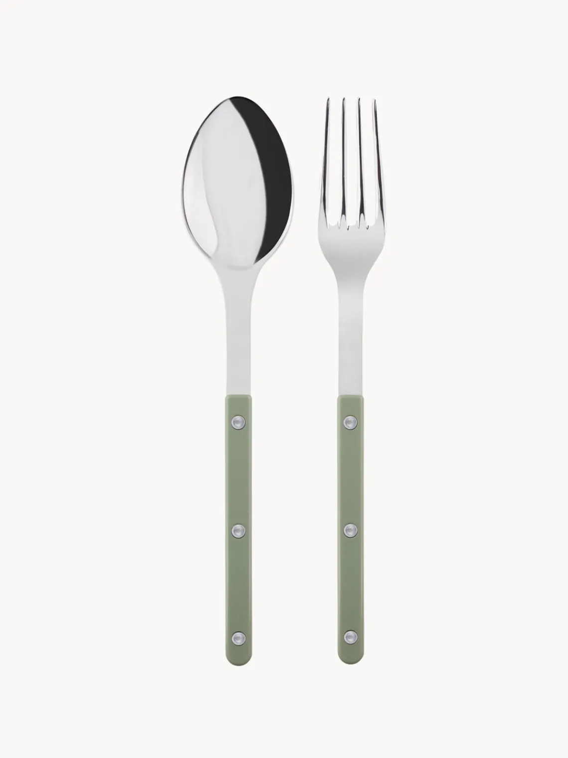 Este set de ensaladera con superficie muy pulida incluye un tenedor para ensalada y una cuchara para ensalada.