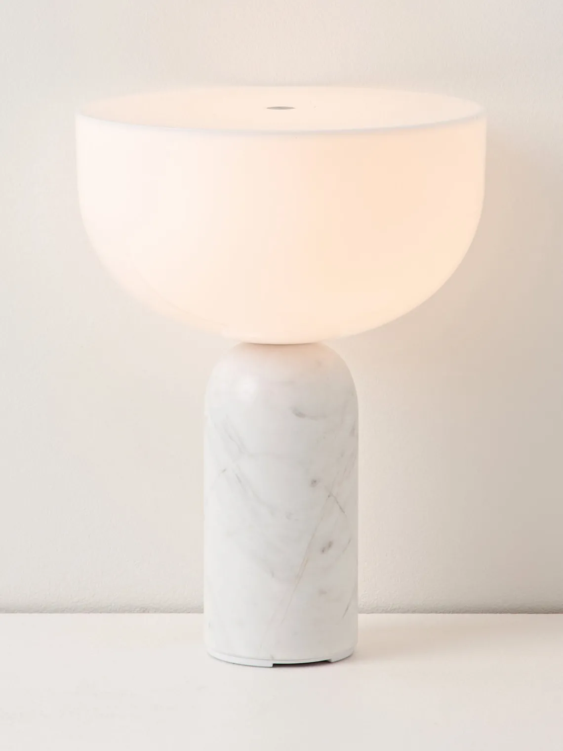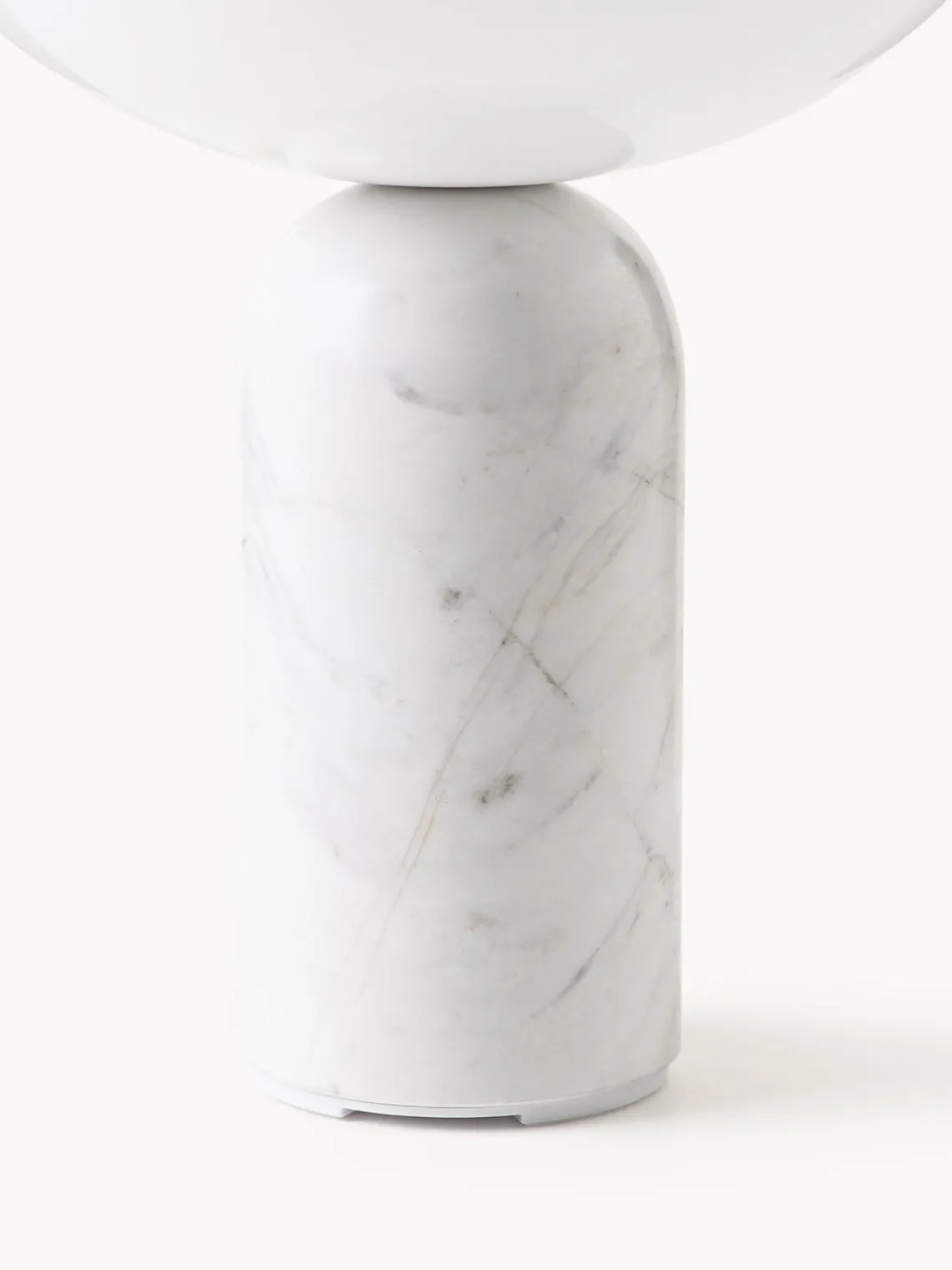 La base de mármol confiere a la lámpara una estabilidad natural, mientras que la superficie pulida se adapta cómodamente a la mano. La luz brilla desde toda la parte superior de la luminaria y proporciona una luminosidad impresionante a pesar de su pequeño tamaño. Un círculo metálico incrustado con precisión en la parte superior añade un sofisticado detalle de diseño y sirve también como regulador de intensidad: la luz puede regularse en tres niveles con un suave toque.