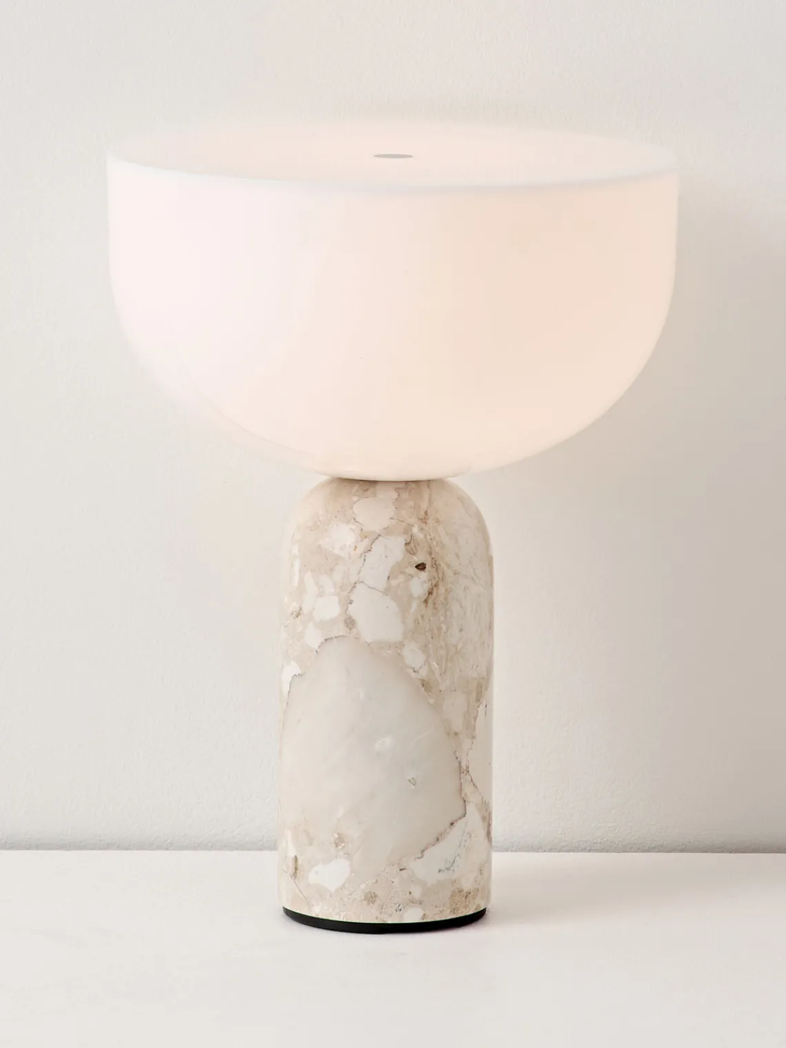 La base de mármol confiere a la lámpara una estabilidad natural, mientras que la superficie pulida resulta agradable al tacto. La luz emana de toda la parte superior de la lámpara, proporcionando una luminosidad impresionante a pesar de su pequeño tamaño. Un anillo metálico incrustado con precisión en la parte superior establece un refinado detalle de diseño y también sirve como regulador: la luz puede atenuarse en tres niveles tocándola suavemente.