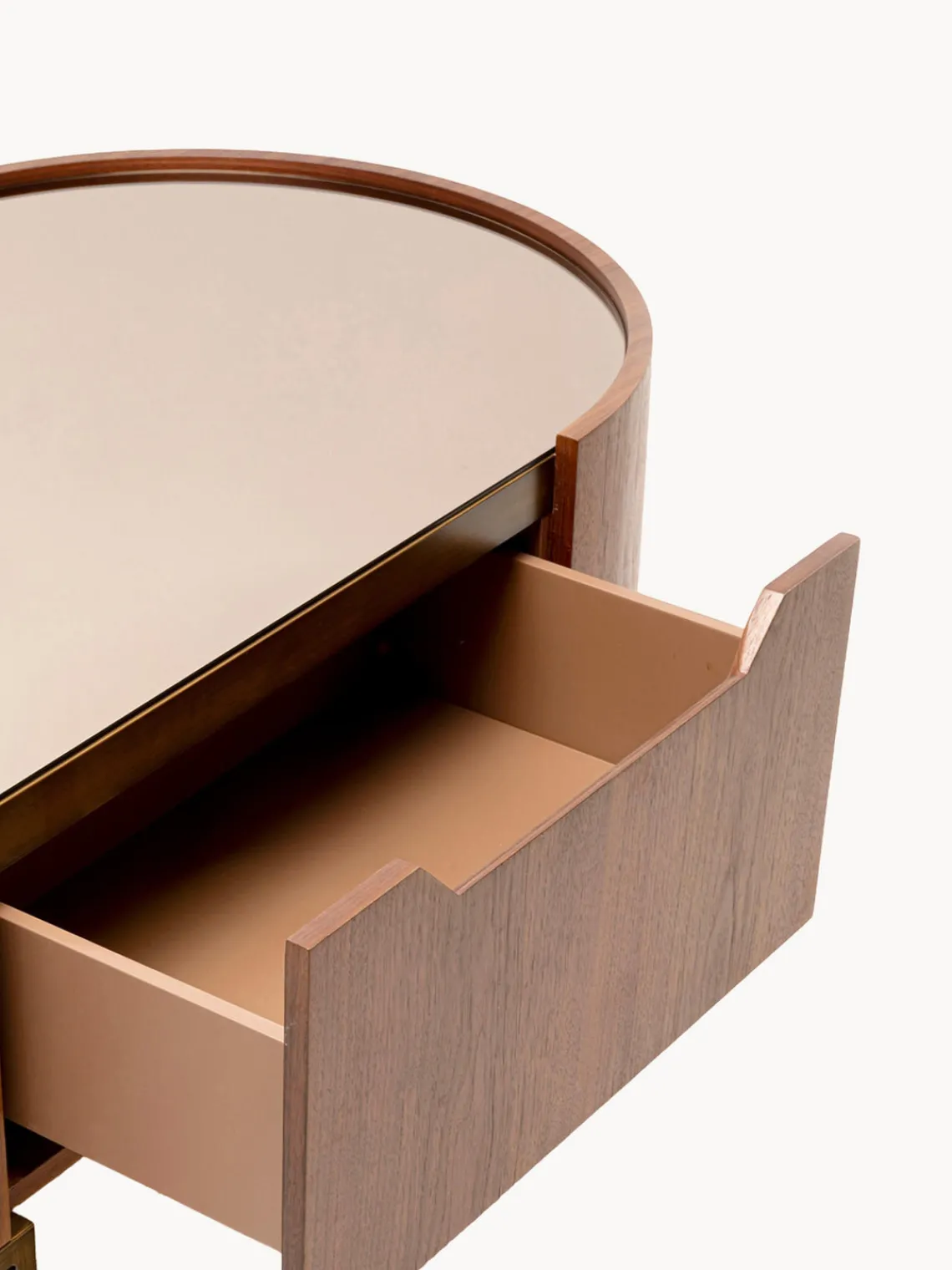La mesa de centro ovalada GIORGIO de madera de nogal cuenta con un revistero integrado.