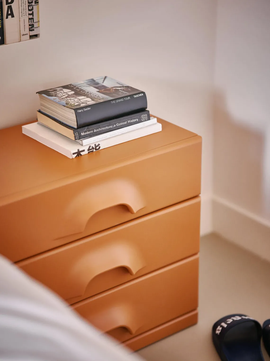 La mesita de noche tiene tres cajones.