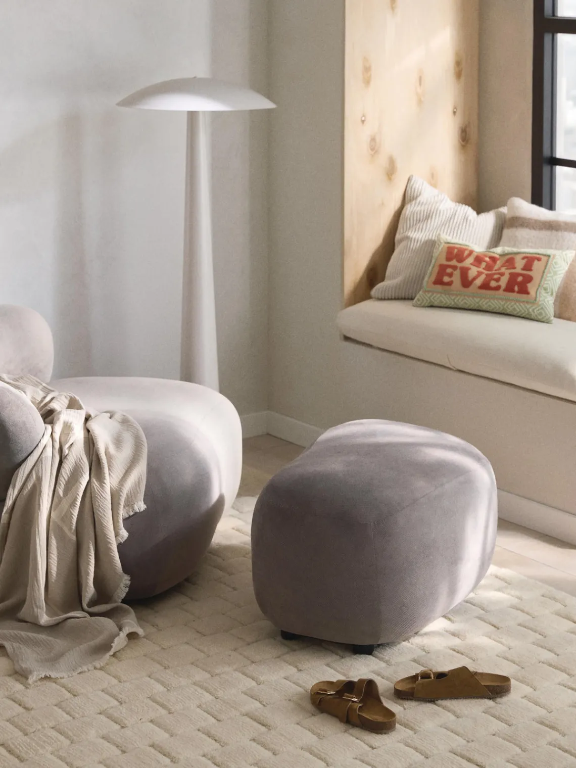 El arco está a la izquierda cuando estás frente al puf. Esto significa que este puf encaja perfectamente con el sillón ALBA con reposabrazos a la izquierda.