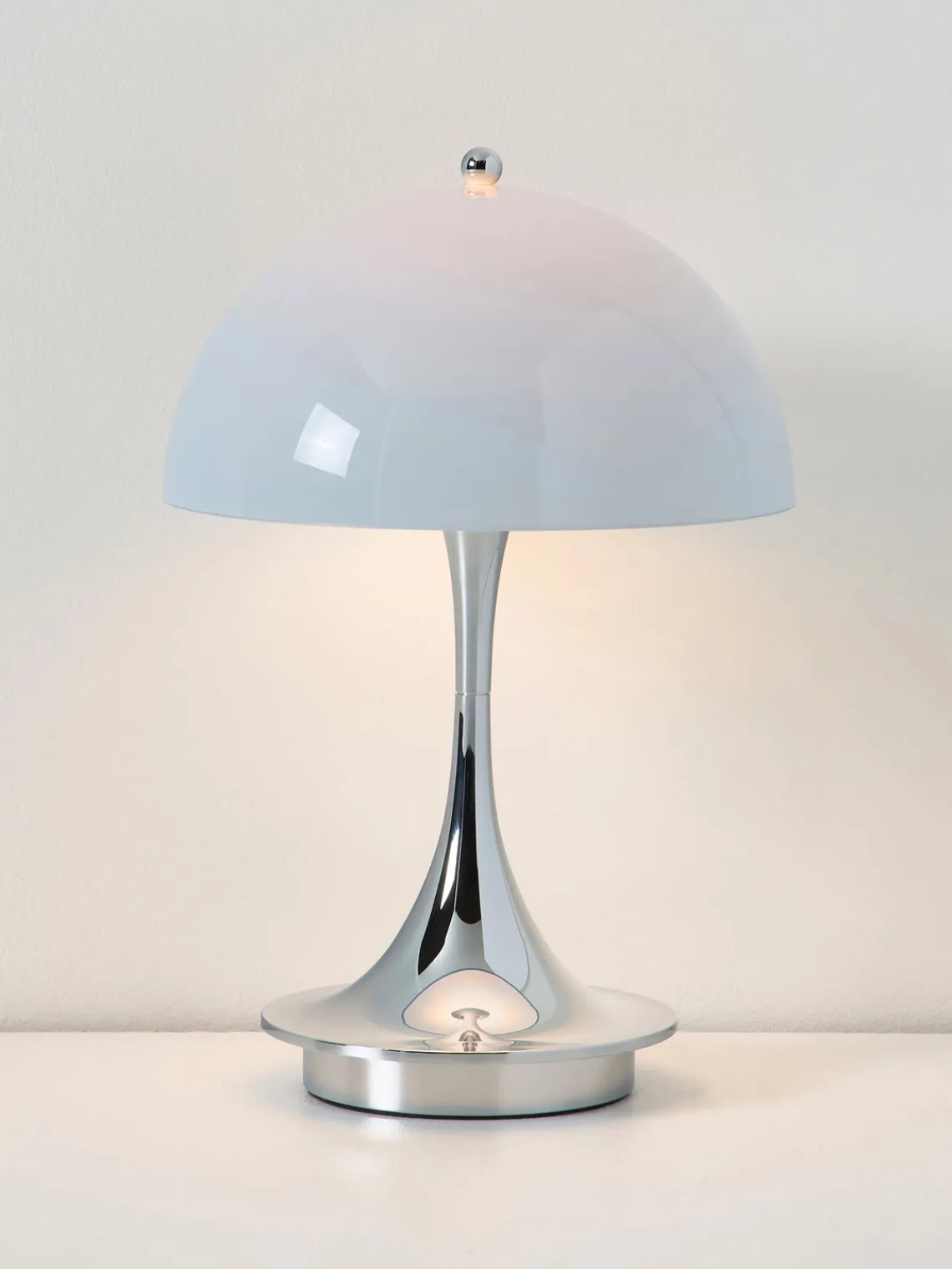 La PANTHELLA fue diseñada en 1971 por Verner Panton en colaboración con Louis Poulsen. Su inusual diseño no sólo refleja el estilo lúdico de Panton, sino que también proporciona una luz única y agradable gracias a sus formas orgánicas. La pantalla semiesférica emite la mayor parte de la luz hacia abajo, donde se refleja en la base en forma de trompeta y baña el entorno con una luz suave y difusa.