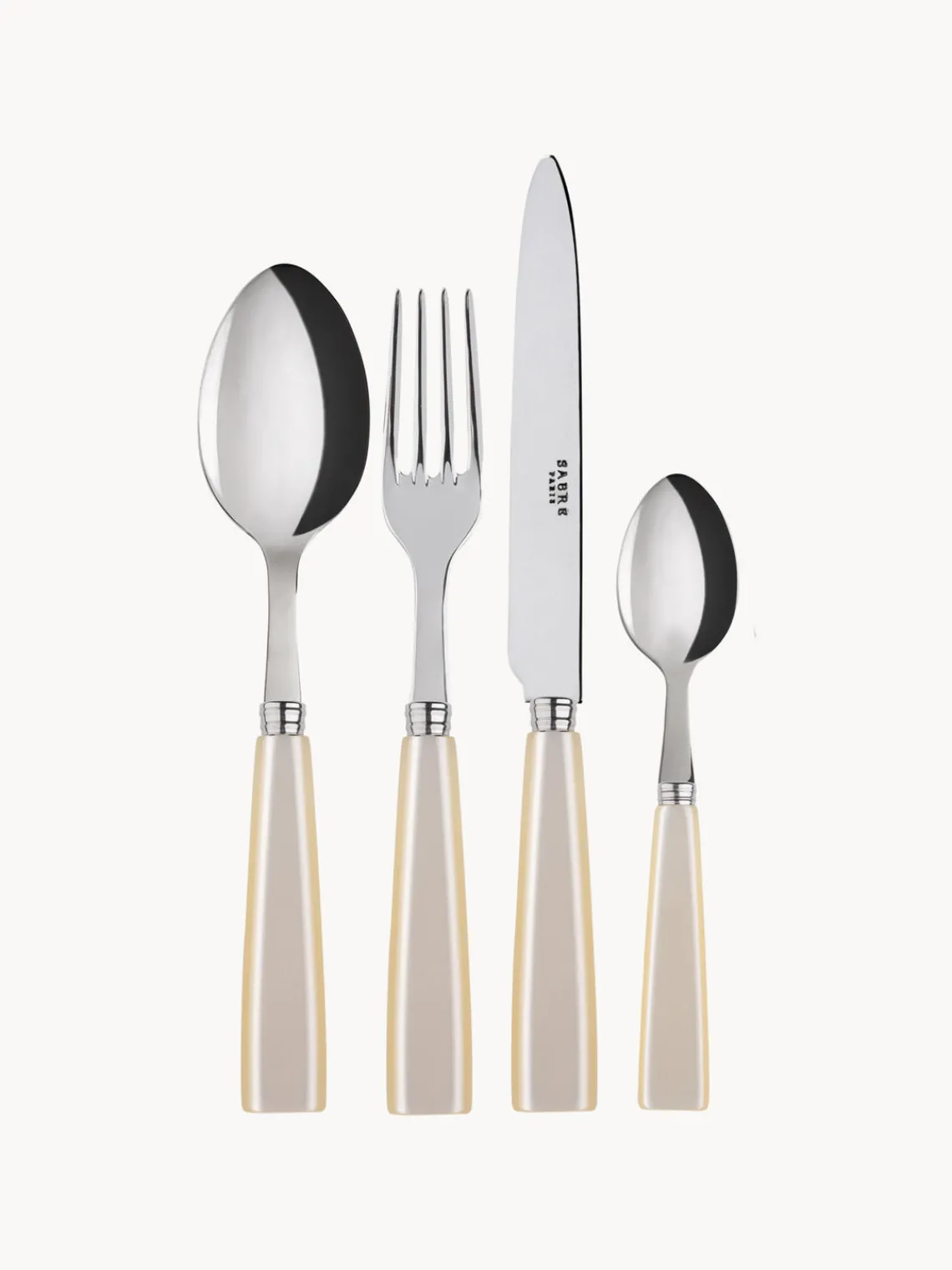 Este set de cubiertos de 4 piezas con superficie muy pulida incluye 1 tenedor de mesa, 1 cuchillo de mesa, 1 cuchara de mesa y 1 cucharilla.