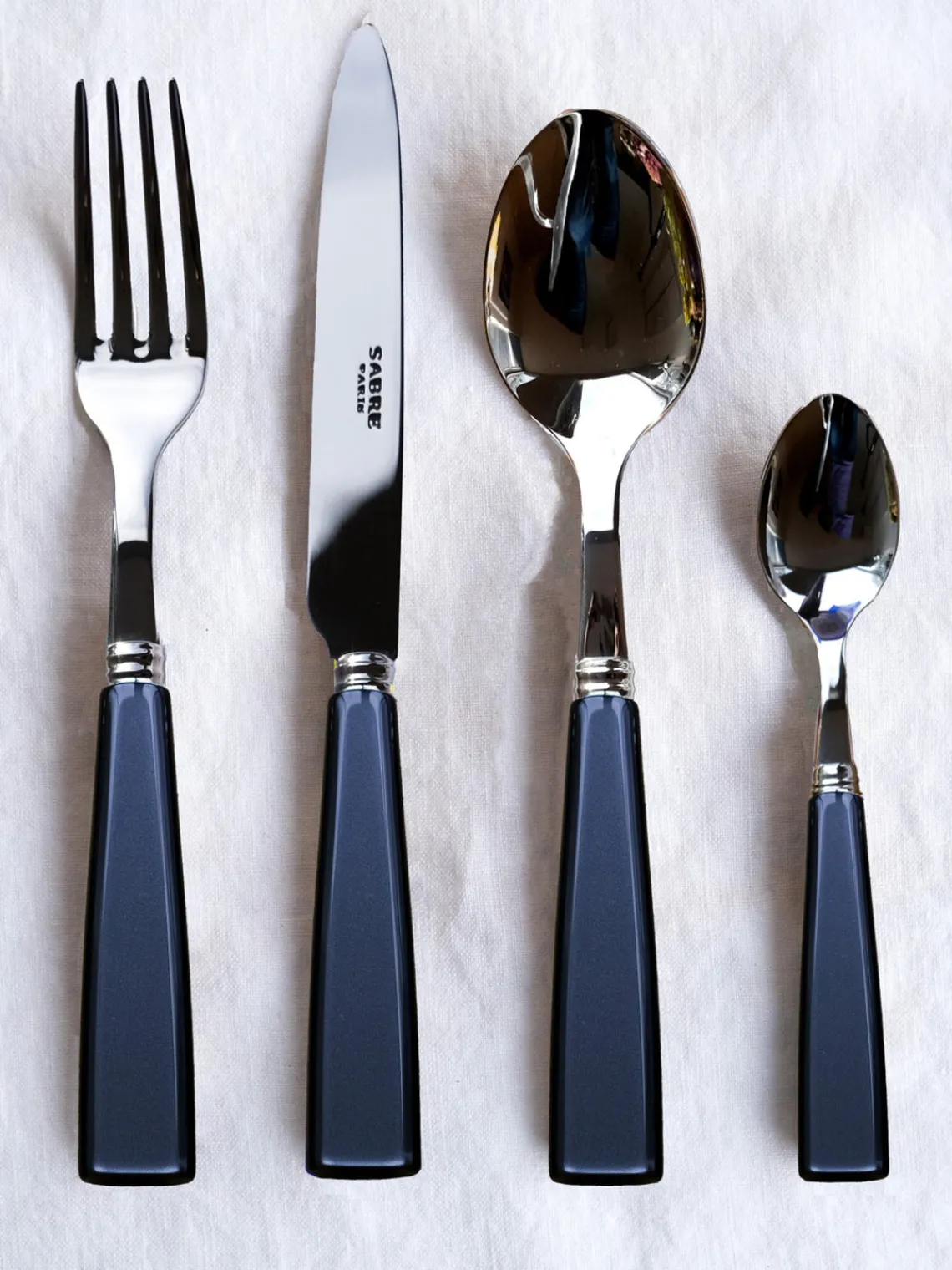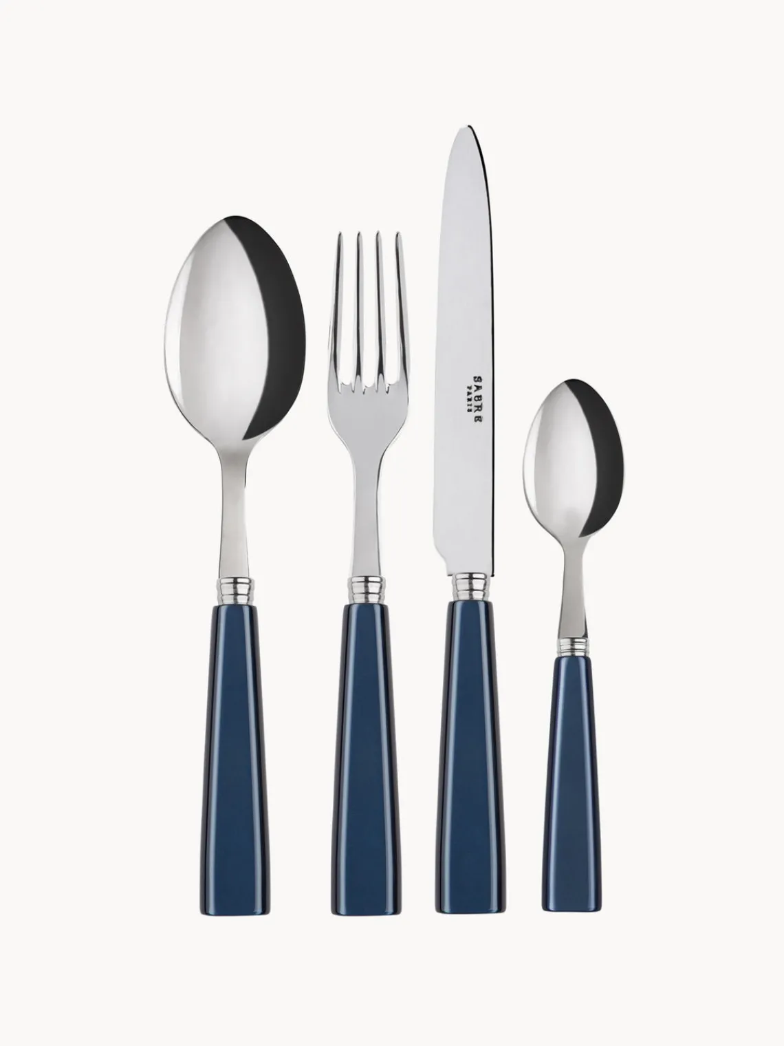 Este set de cubiertos de 4 piezas con superficie muy pulida incluye 1 tenedor de mesa, 1 cuchillo de mesa, 1 cuchara de mesa y 1 cucharilla.