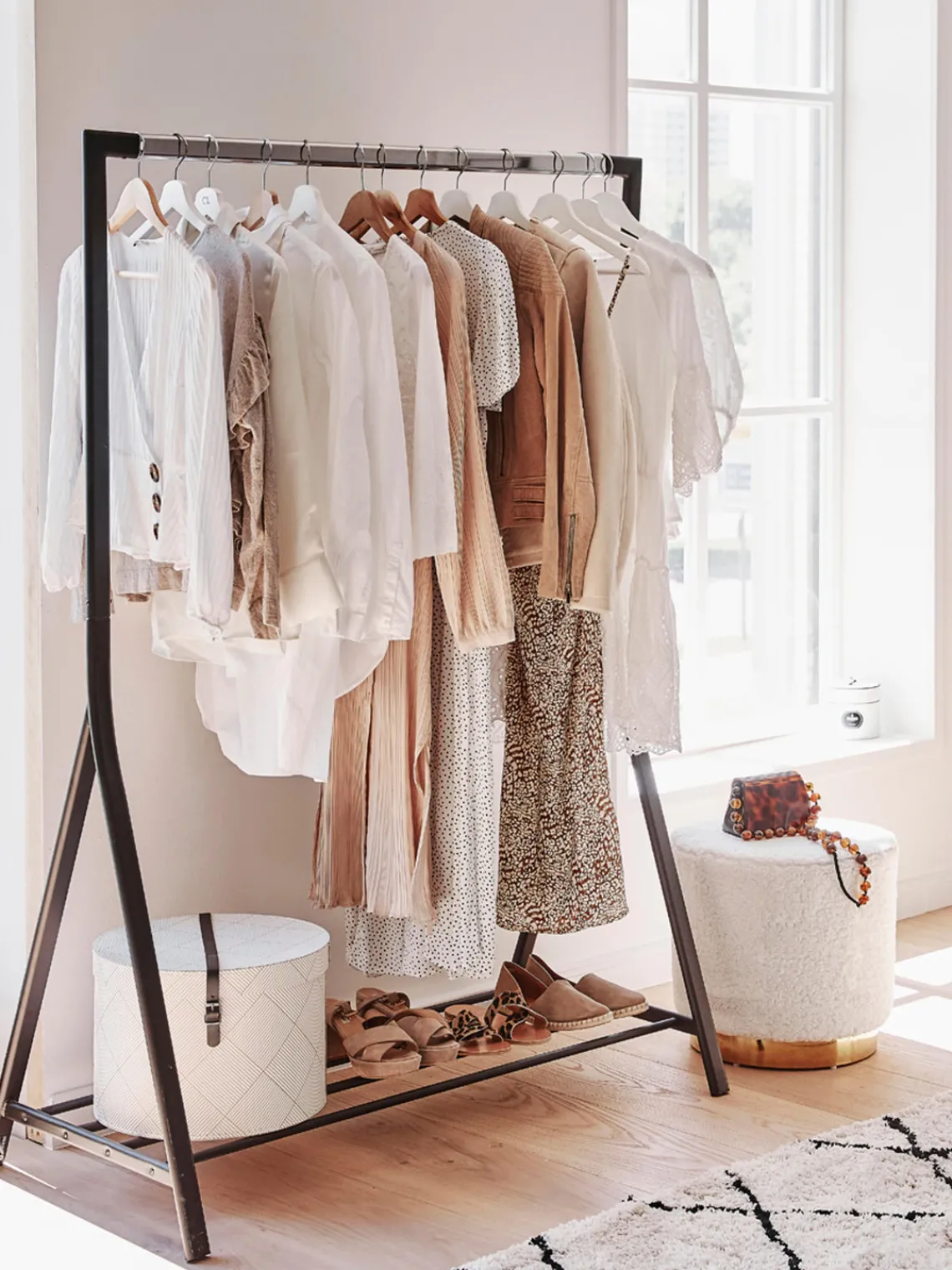 BRENT es tu elegante ayudante para tener un dormitorio ordenado. Presenta tus prendas favoritas con elegancia y mantén la habitación ordenada al mismo tiempo. Con el práctico compartimento de almacenamiento de la parte inferior, ganarás espacio adicional para guardar zapatos o accesorios.