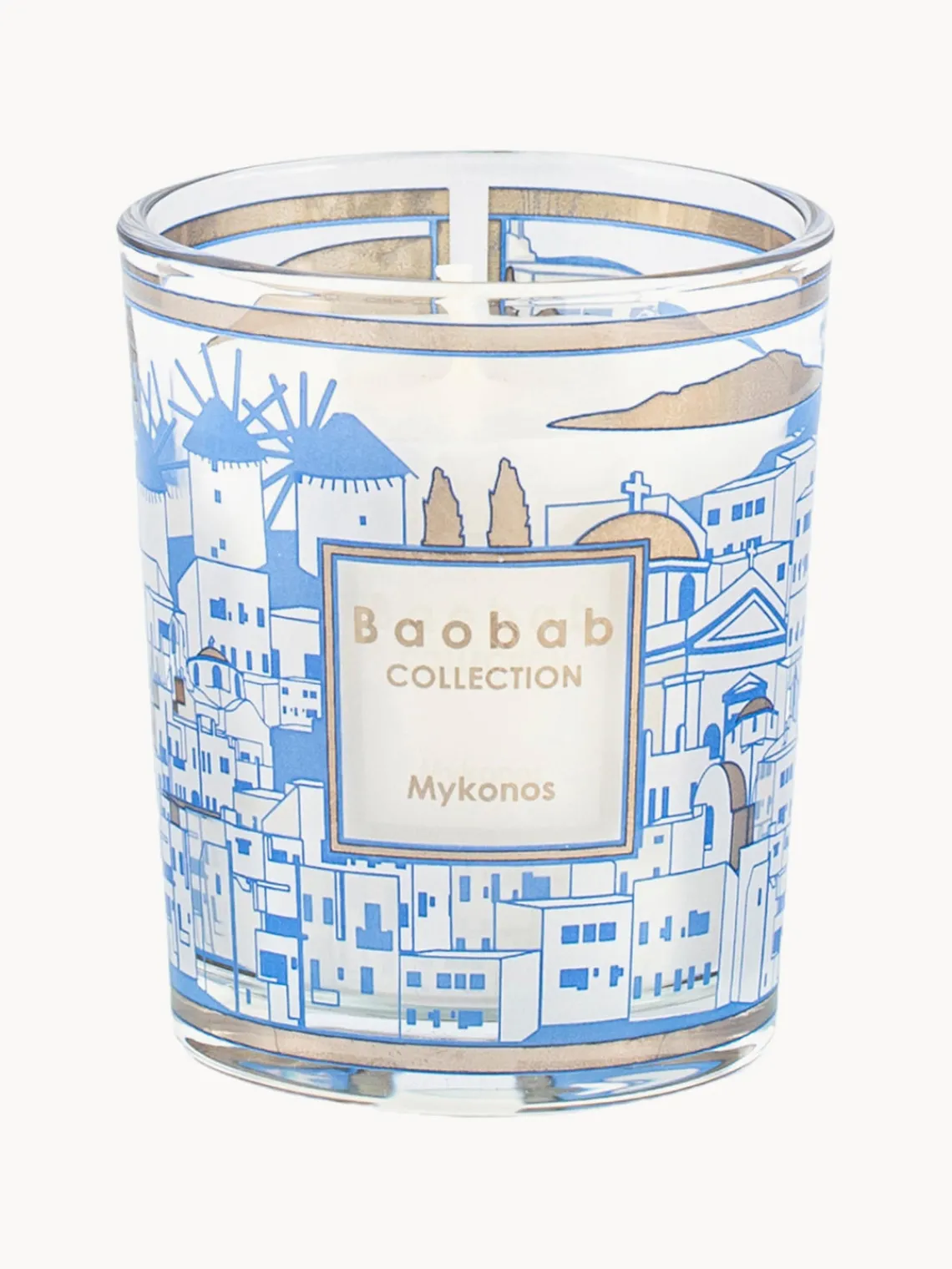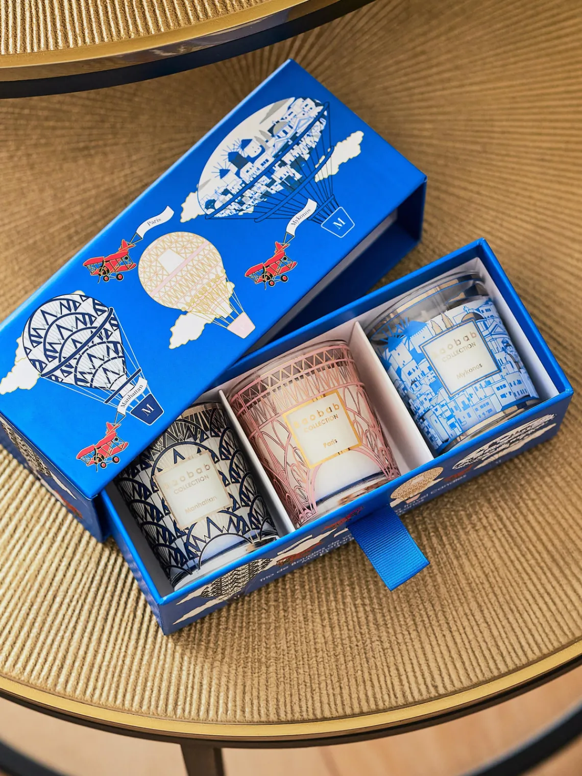 El set viene en una caja de regalo y contiene tres velas perfumadas diferentes: Manhattan (ciprés, lavanda y papiro), Paris (glicinia, mimosa y lima) y Mykonos (tomillo, albahaca y menta).